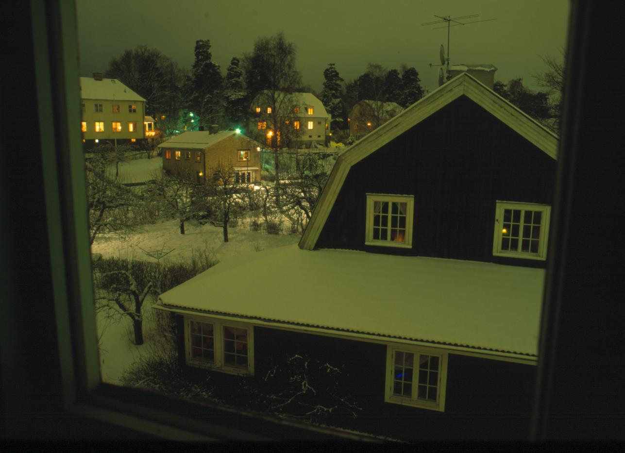 Vy från vinds-rum genom fönster i väst