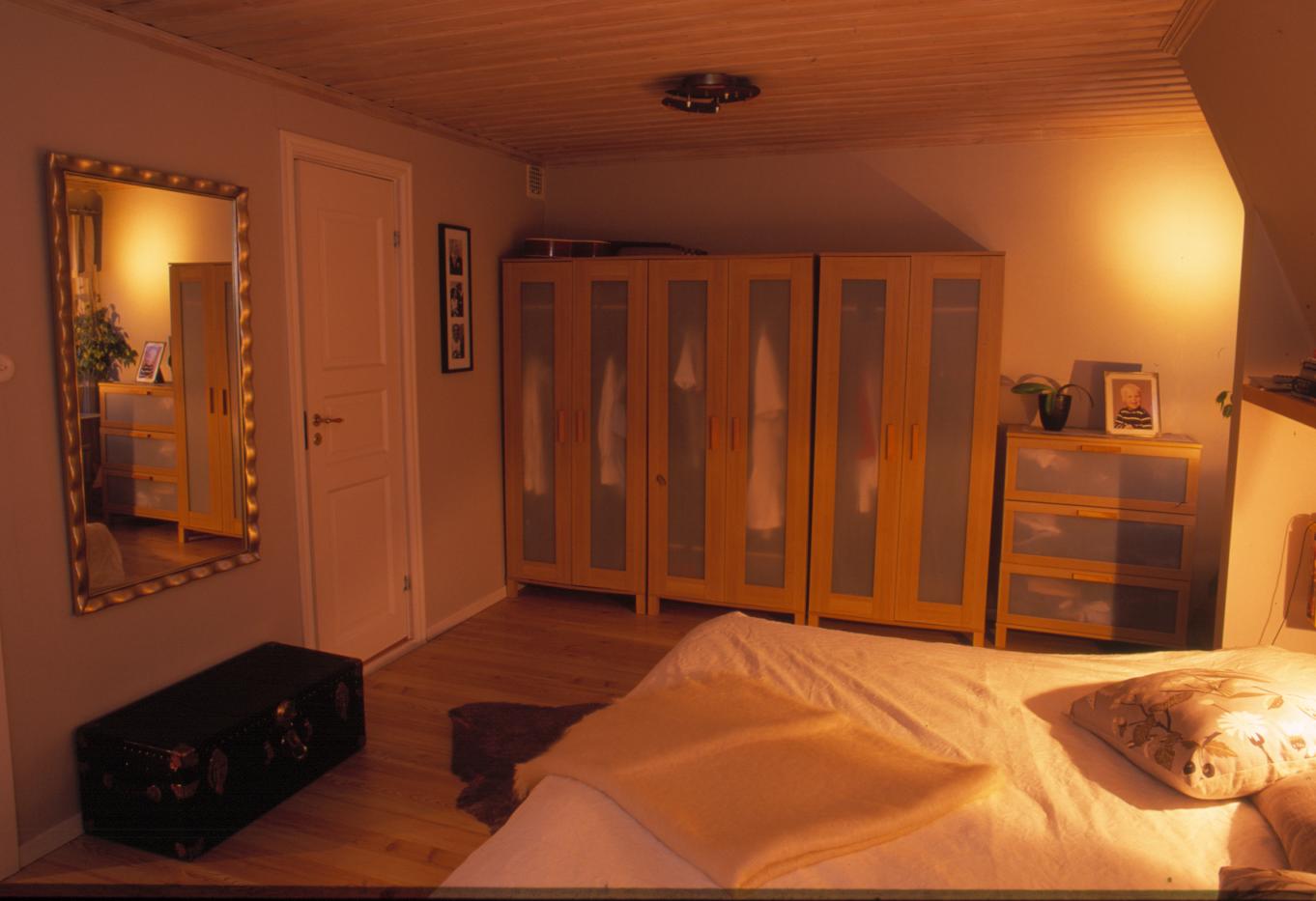 Vy över sovrum med ingång till badrum