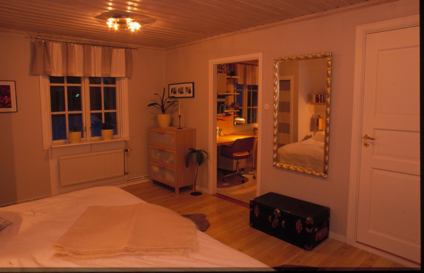 Vy över somvrum med fönster i väst samt dörröppning med övre hall